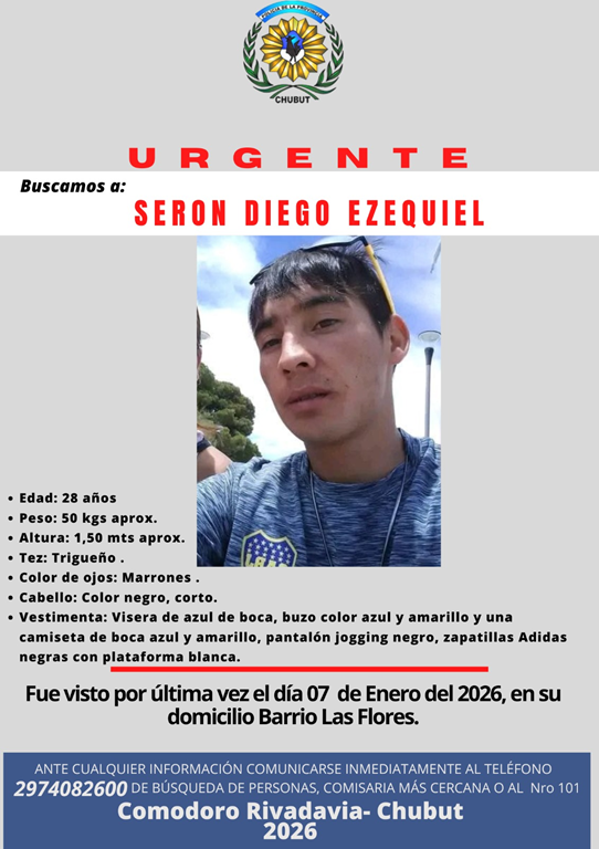 Comodoro Búsqueda urgente en Comodoro: desapareció Diego Ezequiel Serón, de 28 años