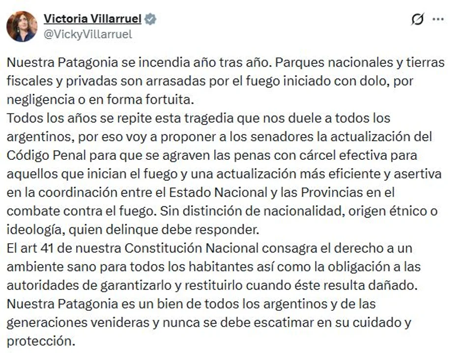 Victoria Villarroel publicó un mensaje en sus redes sociales en alusión al fuego que golpea la Patagonia Argentina. La vicepresidenta recorrió Epuyén y el Parque Nacional Los Alerces este lunes y anunció que propondrá modificaciones al Código Penal con cárcel efectiva para los responsables de los fuegos que afectan a la Patagonia.