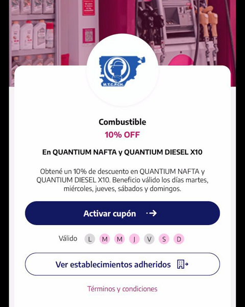 10% de descuento sin tope en combustible para cualquier tipo de nafta o gasoil.