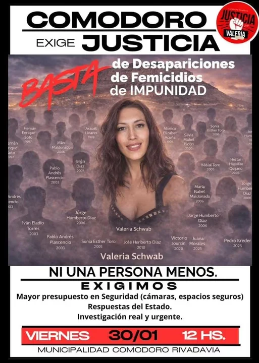 Comodoro Rivadavia volverá a movilizarse este viernes 30 de enero a las 12 horas frente a la Municipalidad, en una marcha que tendrá como eje principal el pedido de justicia por el femicidio de Valeria Schwab.