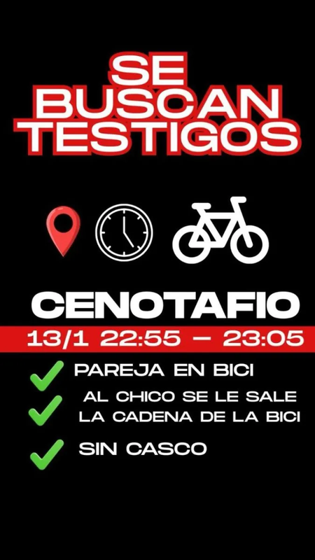 Según la información recabada por la investigación, durante esa franja horaria una pareja circulaba en bicicleta por el sector y podría aportar datos clave para esclarecer lo ocurrido. La descripción indica que ambas personas no llevaban casco y que al hombre se le habría salido la cadena de la bicicleta durante el recorrido, por lo que se presume que no serían ciclistas habituales.