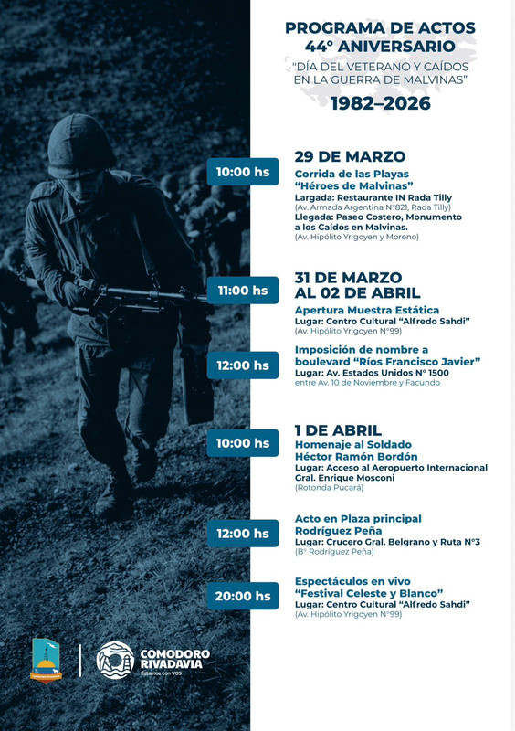 Las actividades comenzarán el 29 de marzo con la “Corrida de las Playas Héroes de Malvinas”, que tendrá su largada en Rada Tilly y culminará en el monumento a los caídos. Luego, entre el 31 de marzo y el 2 de abril, se llevará adelante una muestra estática en el Centro Cultural “Alfredo Sahdi”, junto con la imposición de nombre a un boulevard en honor a un excombatiente.