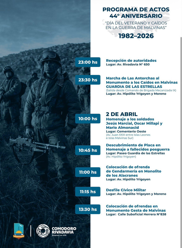 La ciudad de Comodoro Rivadavia se prepara para conmemorar el 44° aniversario del Día del Veterano y de los Caídos en la Guerra de Malvinas con un completo programa de actividades que se desarrollará desde el 29 de marzo hasta el 2 de abril.