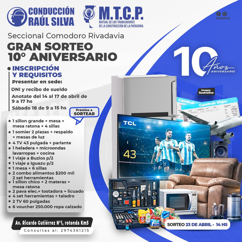 Además, el sábado 19 de abril la Mutual estará abierta de 9 a 15 horas exclusivamente para que los trabajadores puedan inscribirse. El sorteo se realizará el 23 de abril y será transmitido en vivo desde todas las filiales de la Patagonia.