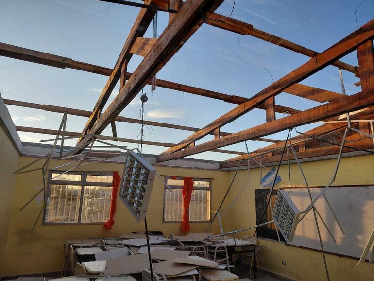 La Escuela Provincial N° 7702, se vio fuertemente afectada por los vientos del lunes, los cuales arrancaron gran parte del techo de la parte oeste del edificio.